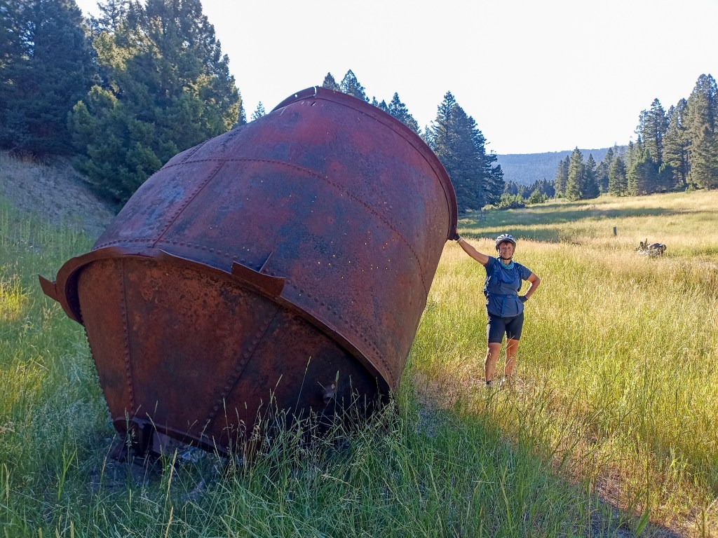 An old hopper ( the brown thing, not Jane!,at Empire mine, an old gold mine in Poorman’s Creek.