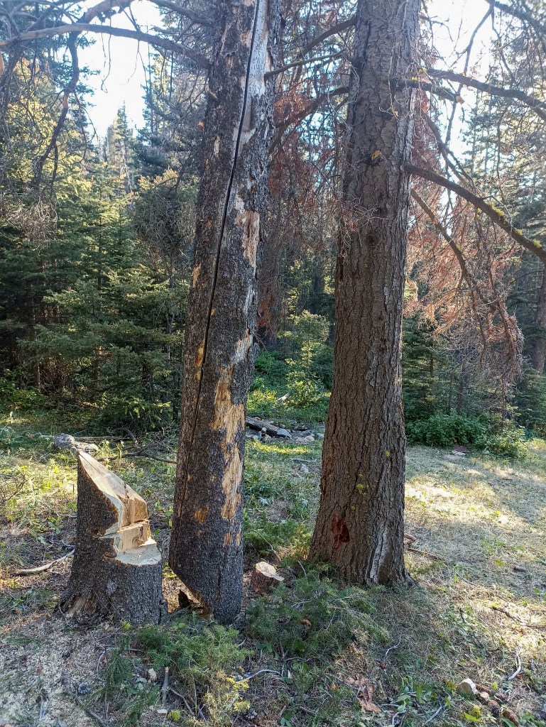 We then headed south to the hills and a high wild camp. The route up was complex, including a section of old railway, some steep single track, and the usual forest road grind. We were roasting in the heat and a family gave us some water at a trailhead carpark halfway. Water was sparse so we filled up our bottles at a stream shortly before the camp, just before the summit. There were scattered shotgun cartridges, other signs of use, and a tree that had been cut and left resting precariously on its tip.