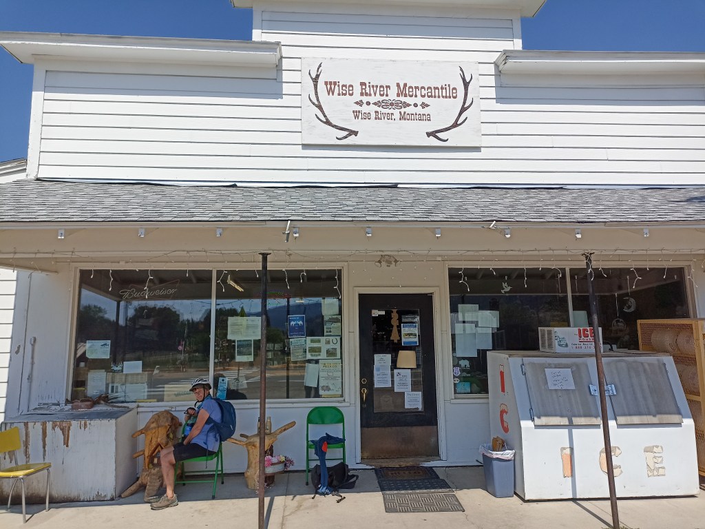 A long descent to Big Hole River noted for fishing, and to Wise River, a welcome tiny settlement at a road junction, one shop, and two bars. Good meal at the saloon bar and a useful stock up of noodles in the shop. Then a pleasant final ride up Wise River valley on tarmac to the campsite.