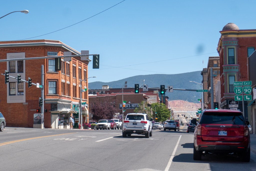 Another long day, broken by a lunch stop in Butte city centre. the route follows a winding valley west of Basin over a few low ridges to Butte, which sits exasperatingly on a high shelf. This is a beautiful old red brick 1930s industrial looking town with lots of old mines and a huge open cast poisoned hole, Berkley mine, right by the town centre! Had a rare real food meal at Uptown cafe, an odd cafeteria set up in a restaurant setting.