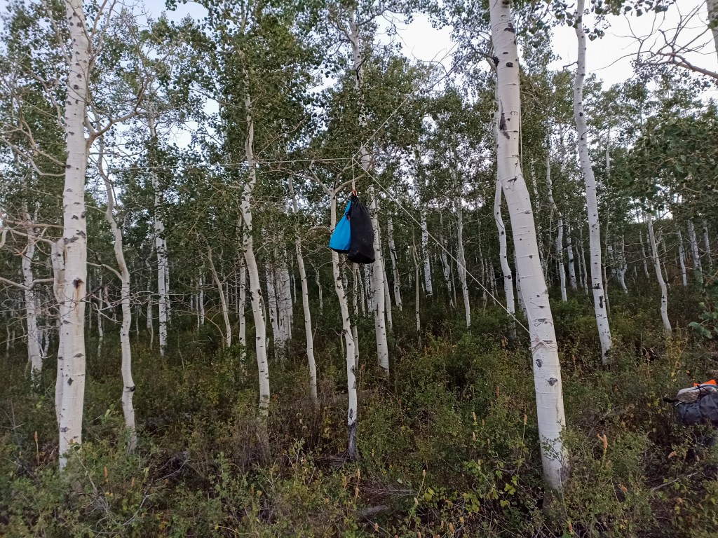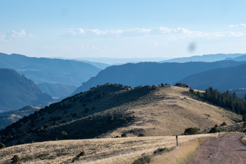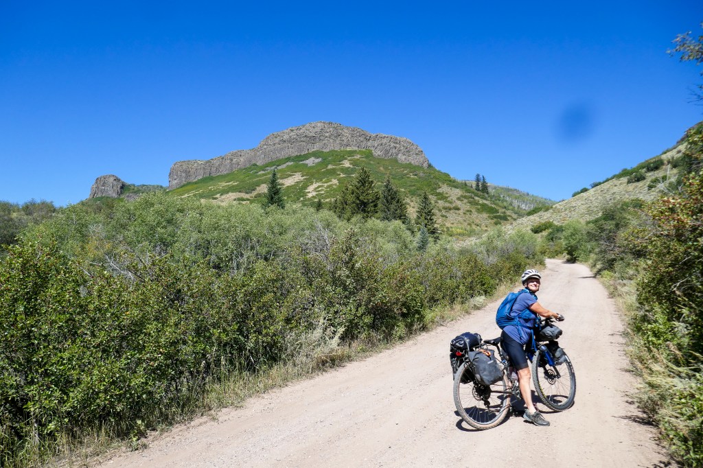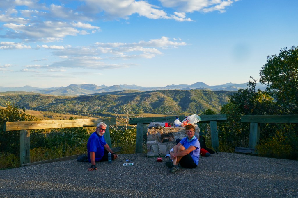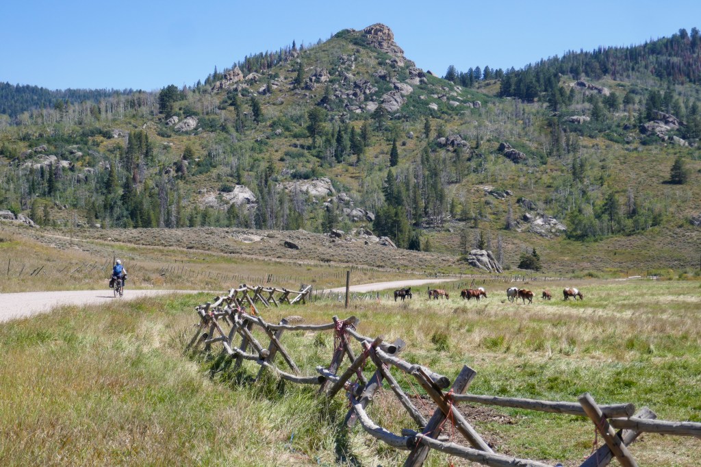 A brilliant day: fast riding on a deserted paved road south of Rawlins that gradually climbs, with some great roller coaster sections, to a national forest where the road turns to gravel and climbs into a mix of grassland, pines, and aspen trees. We camped soon after the so-called “Aspen Alley” (where the road is single-lane and crowded on either side with Aspens) at a lookover/picnic spot from which we could see across to the hills of Northern Colorado. Water was very scarce again and we were glad to fill up at a forest service cabin just before we set up camp. A lot of height and distance but aided by a long section of paved road. We came across hunters, with September being the start of the season with the proviso that only bows and arrows are used! My introduction to this was going for a widdle in the woods and finding a foam cube used for target practice, so I hurried back to the track!