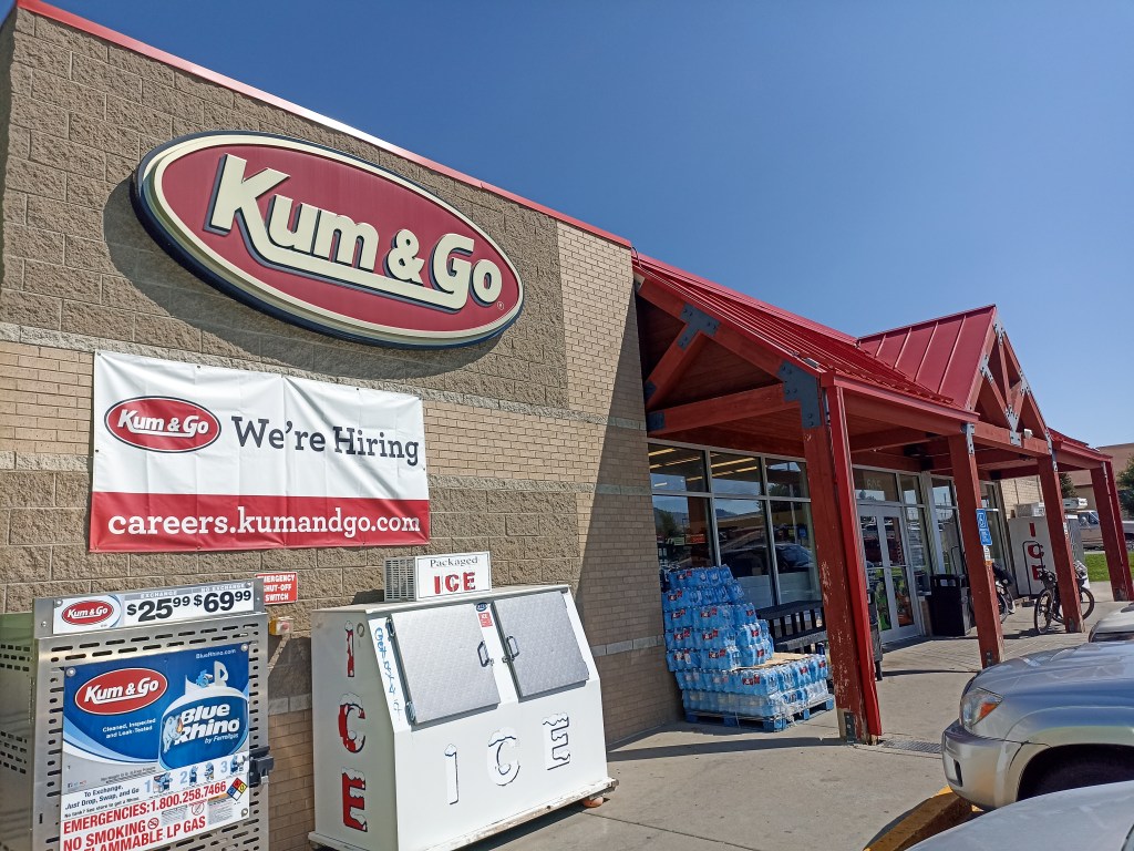 The route follows a gravel road winding up and down bluffs by the Colorado to a small town called Kremling, and then climbs up a long open valley to Ute pass at 9600 feet, before descending to a busy paved road to Silverthorne. Kremling was our introduction to the convenience store group with the best name in the USA – Kum and Go!