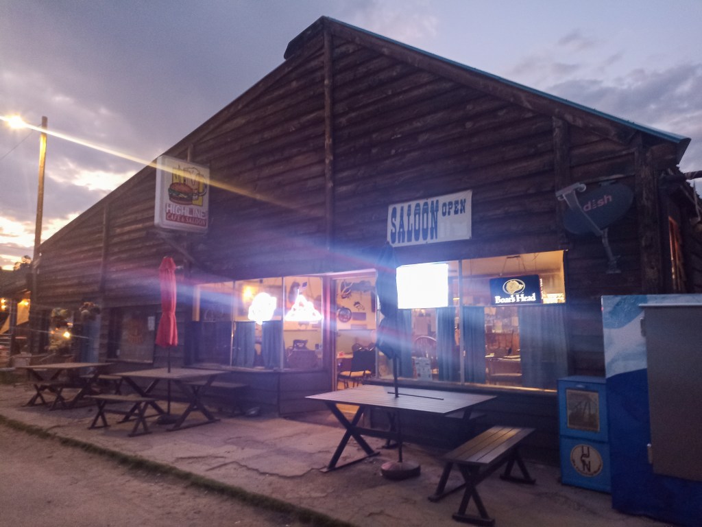 Over the pass, the terrain changes to drier scrubby prairie, with a long descent to the tiny village of Como and then a tiring drag to Hartsel on terribly washboarded gravel roads. Hartsel has a great saloon bar stopover, where we camped for free in its backyard and had a pretty good meal. We were dodging some thunderstorms on this day but thankfully stayed dry.
