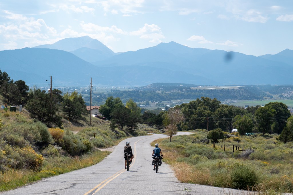 The final day of this section across more washboarded gravel roads and over a lowish pass to Salida. Felt like hard work going over the final pass: the past few day’s efforts had taken their toll. So glad to coast down the long descent to Salida in anticipation of a rest day, and the benefits of a smart town with good facilities, and happy to have completed another ACA map. Also, a relief to leave the high, windswept scrubby high plains for the lush valley Salida sits in, surrounded by the Sawatch hills and by what are known as the collegiate peaks – named after famous American universities.