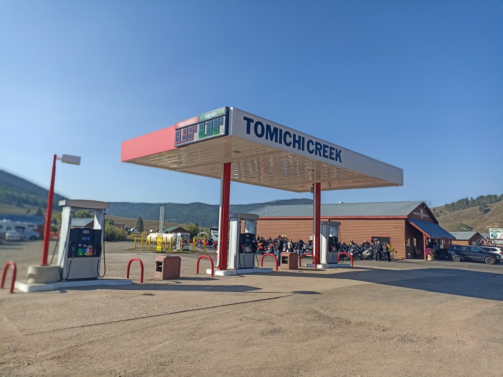 Across the continental divided westwards, over the high (10842 ft) but well-graded Marshall pass to Sargents, a remotish small rural settlement set in drier looking terrain. It has a great gas station stop, with a large cafe/bar, shop, and simple camping. The ride was very pleasant, winding at a constant angle up through forests with wonderful views across the valley to the distant peaks, and passing above a gorgeous-looking campground by a lake. A few 4WD vehicles were making the crossing too, but not so many to be any problem. After a fast descent through aspens and an open valley with several beaver dams, we arrived in Sargents with plenty time to relax, scoff good food at the gas station and, bizarrely, watch the deceased queens procession through the streets of Edinburgh, with full British pageantry.