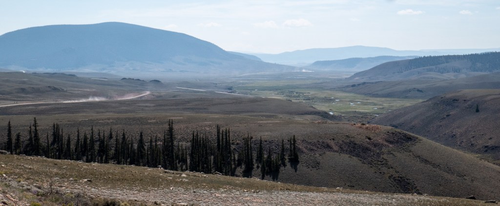 The route mainly was up a long, wide open, and deserted valley climbing back up to the continental divide into the Rio Grande National Forest, and then winds though smaller hills and the Carnero pass towards Del Norte, the last town in Colorado. I was quite thrilled to see we had got to the hills where the mighty Rio Grande starts: it felt like we were really getting well on our way.