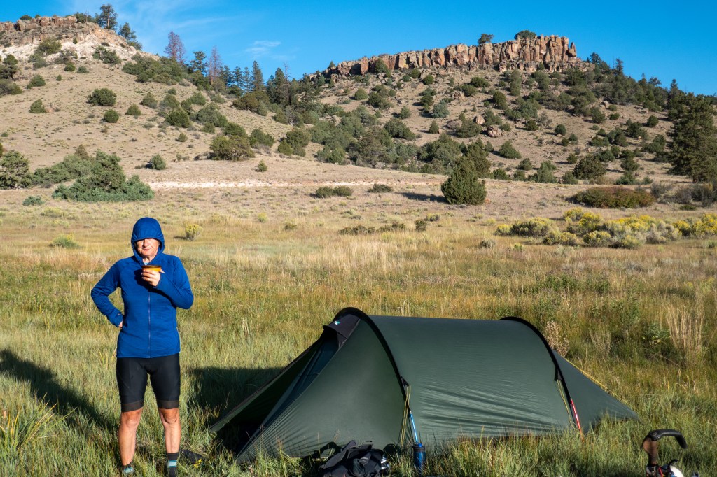 Disappointed to find the national forest campground devoid of water, so I had a long trip to the lake to filter water. The campsite hosts kindly did give us some bottled water they reserved for hiker bikers. Gregg from Sheffield caught us up later in the day and shared our pitch. We were running low on food and tucked into our last packet of noodles( no shops since Del Norte apart from snacks etc at Platoro) but Gregg calmly pulled out a chopping board, proper pans, and some real veg/springs onions to make himself a real dinner! Now that’s proper long term cycle touring for you…