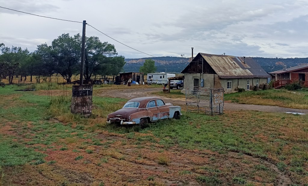 We left the short section of the paved road at Vallecitos, home of the most run-down car repair shop we saw in the whole trip, called something rude that I wish I could remember, something like Asshole Repairs!