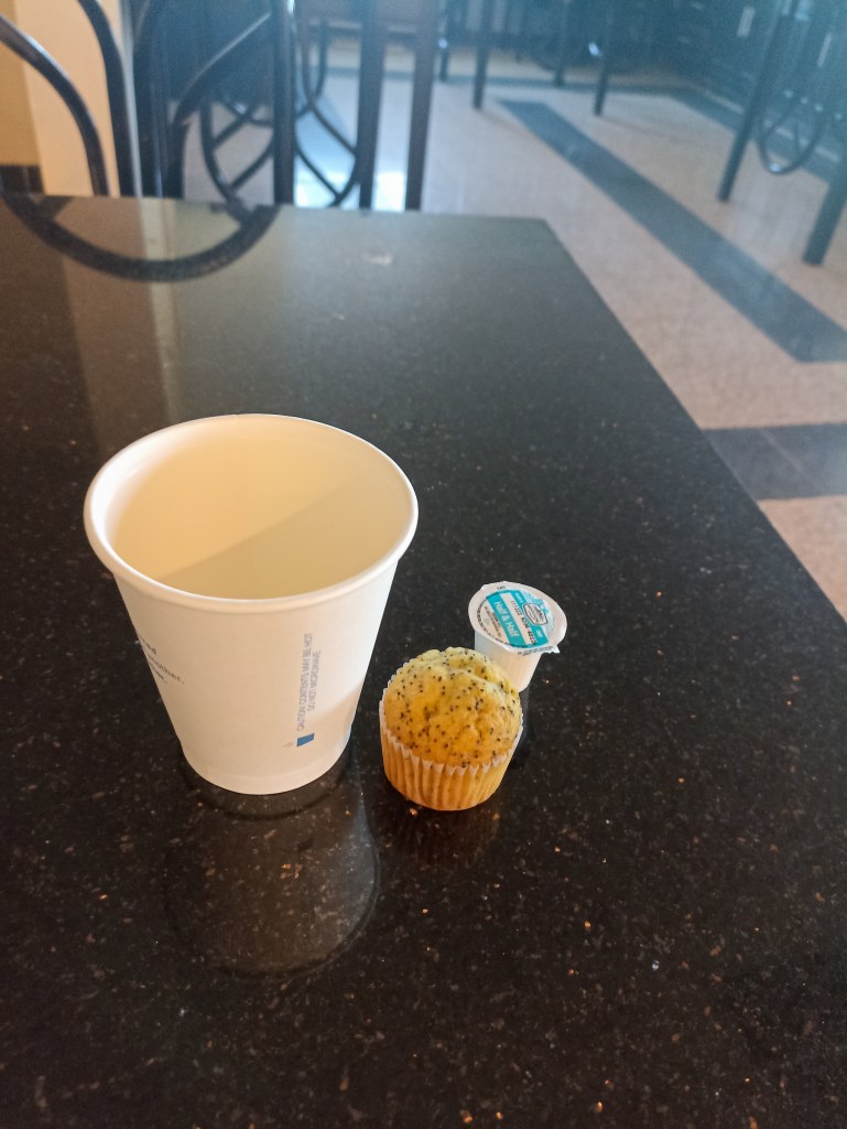 Here we stayed in the Days Inn and suffered the tiniest ” included breakfast” I have had in my life. The picture below, a breakfast muffin with a pot of milk and a small coffee cup for scale!