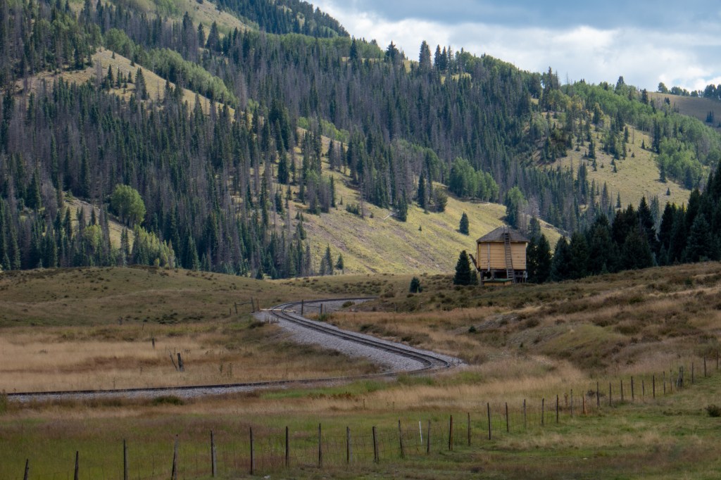 Once over the pass, we descended briefly on gravel into the top end of a broad valley where the historic Cumbres and Toltec steam railway runs. We waited a while to try to see it pass, but ran out of patience and carried on, only to hear it toot its whistle behind us as we piled down the track!