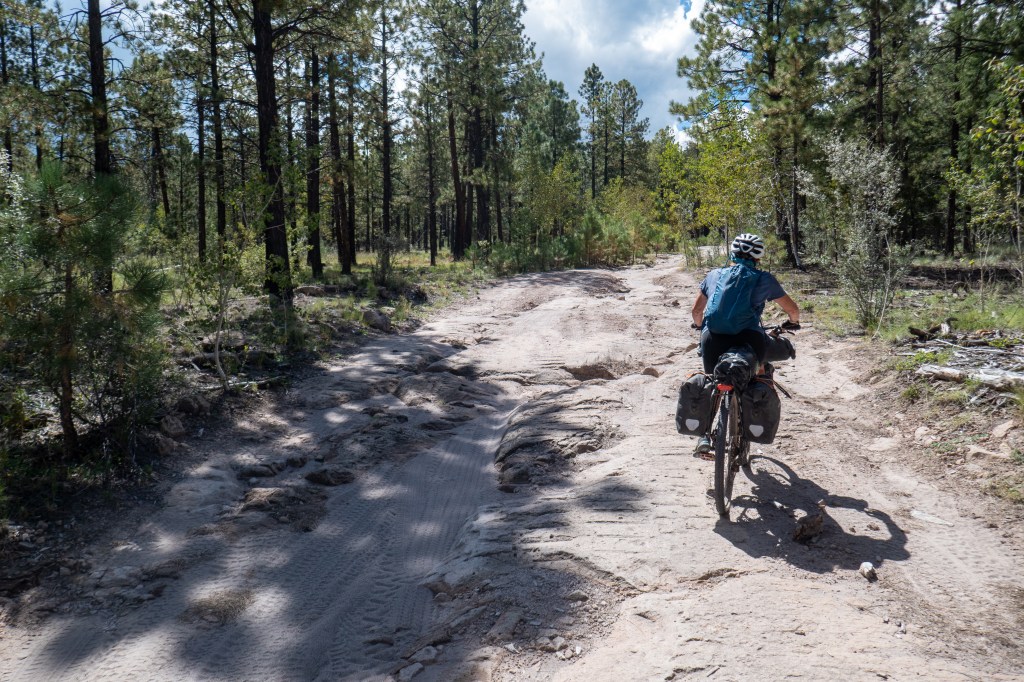 The downhill was all too brief, and an entry sign into New Mexico marked the start of our initiation in New Mexico gravel riding. Steep, rough and knackering all the way to the well hidden campsite – for once very glad of our sat nav as we nearly gave up: the promise of water at the campground kept us going as there was no water anywhere else after leaving the little valley by the border signpost.