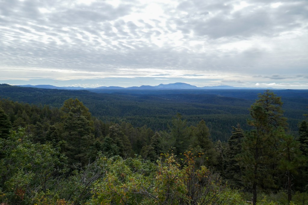 The terrain here proved typical of much of the new Mexico high ridges/plateaux. A mix of short pine trees and grassland, with never-ending ups and downs on very rough tracks. At this time of year quite well occupied by hunters in ATVs. One section, to reach the ridge overlooking the immense Cruces Basin was sheer hell, but quite short.